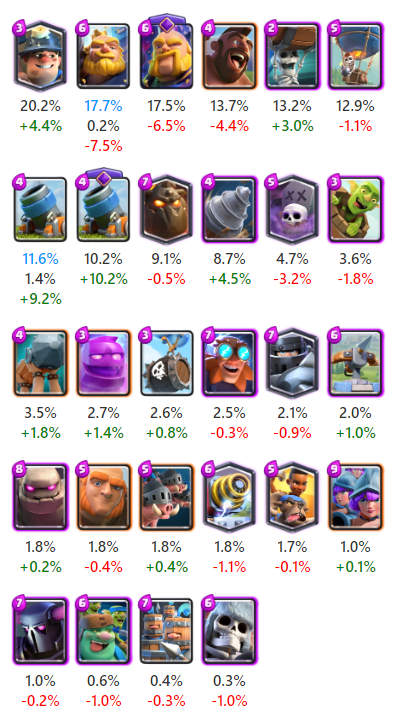 HPが減少する弱体化の影響かロイヤルジャイアントの使用率が落ちました。それでも最高レベルですが。