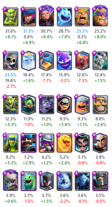 ここまで見たカード以外で言うと、アイススピリットやゴブリン系のカードの使用率が伸びました。