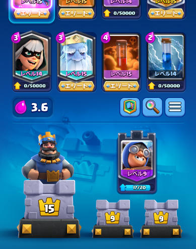 例えば、ブラスターをレベル14まで上げるには、合計で427枚のタワーユニットカードと239400ゴールドが必要となります。そこからレベル15(エリートレベル)に上げるには50000エリートワイルドカードが必要です。