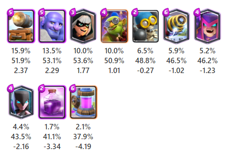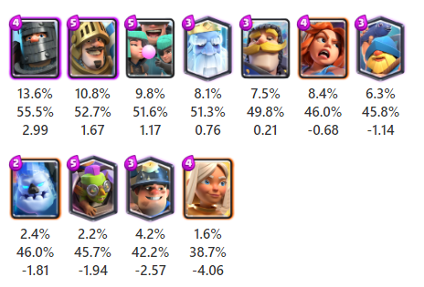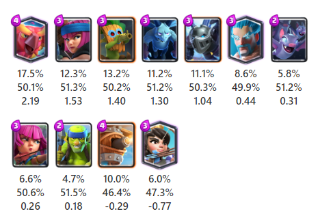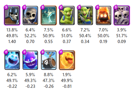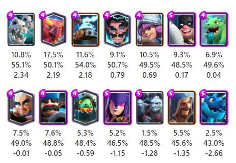 ここでは最近のバランス調整で範囲攻撃の範囲が広くなるという強化を受けたばかりのスケルトンドラゴンが1位となりました。使用率は3番目ですが勝率が高くなっています。