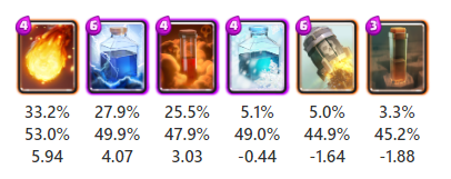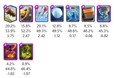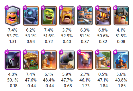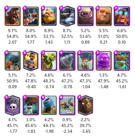 地上受けグループのディガーや細かい系グループのスケルトンバレルは相手タワーへのダメージを狙う手段となるカードですが、今回の調査では平均以下の強さという結果となりました。