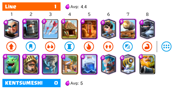 KENTSUMESHI選手はロイヤルホグ・バーバリアン・ザッピーという、相手の呪文で処理されにくいユニットを活用し優勢に試合を進める。