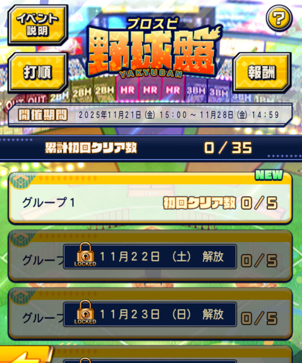 まだイベントが始まったばかりで残りのグループは見れませんが、普段リアルタイム対戦をやっていたりプロスピAのバッティング操作に慣れている人にとってはそんなに難しくないイベントなのかな?という印象です。