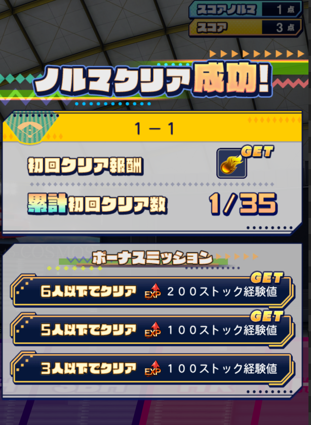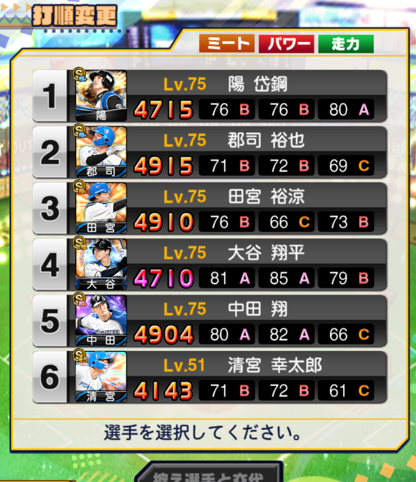 ボーナスミッションをクリアするには少ない人数でクリアする必要があるので、最後の方に長打を狙える選手を置くのがいいかな?と思います。