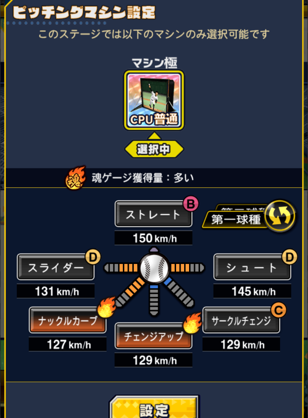 プレイ中は球種の情報を確認できないので、ピッチングマシン設定の画面で確認しておくといいね!