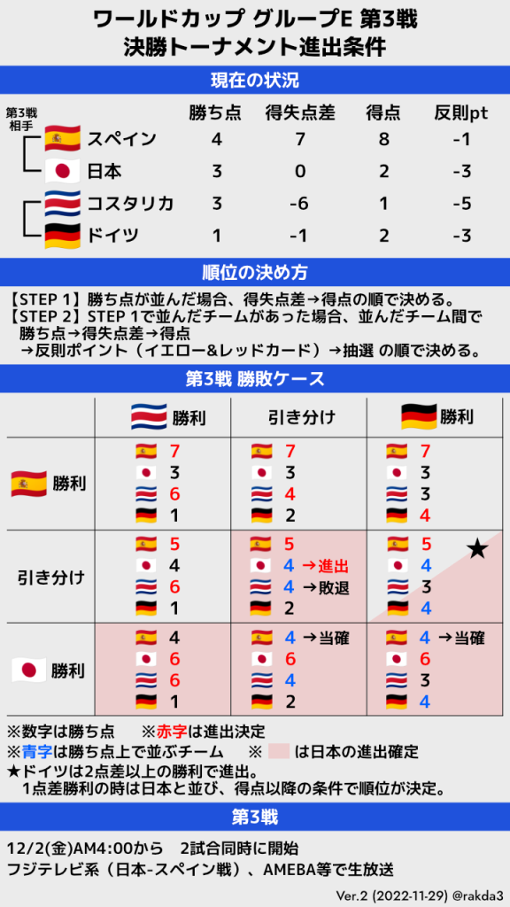日本の視点で見ると、第3戦に勝てば進出、負ければ敗退。引き分けだとコスタリカードイツ戦の結果次第となります。
